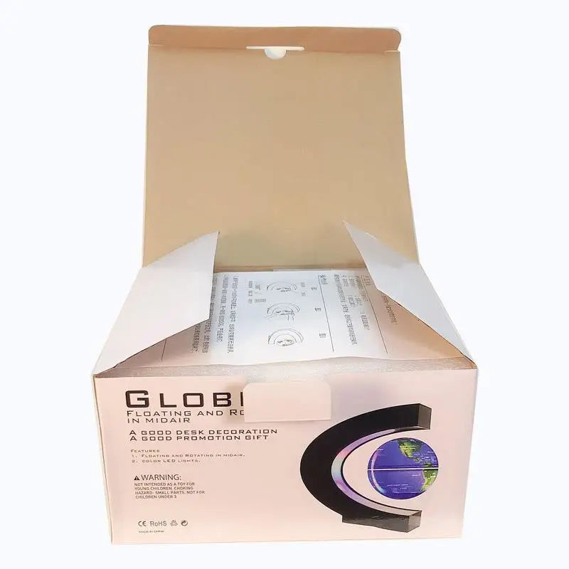 The Magnetic Floating Levitation Globe (Model: C3) is an electronic anti-gravity novelty lamp (Brand: NoEnName_Null) featuring a detailed LED World Map. This modern table lamp is powered by AC (110V/220V) and certified with CE, EMC, and RoHS. It serves as a unique piece of home décor for the bedroom, an educational tool, and an excellent birthday gift. Available in Silver, Blue, and Gold ball colors.