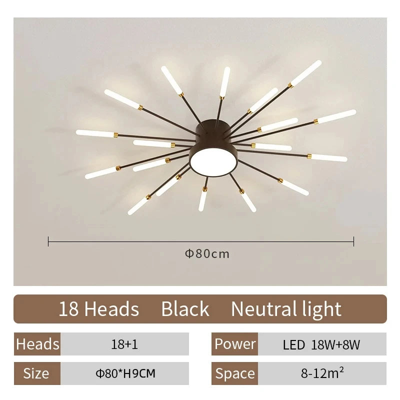 Elevate your space with this Modern LED Ceiling Chandelier featuring a stunning Fireworks Shape. Perfect as Designer Ceiling Lights for the Living Room or Bedroom. It includes integrated LED Bulbs, operates on a wide 90-260V range, and is constructed with durable aluminum and iron. Available in elegant Black and Gold finishes with multiple light head options (12 to 42 heads) emitting Natural Light.